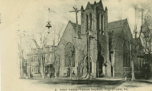 At first, the Presbyterians met for worship at a Methodist church in town. But by 1853, First Presbyterian Church was ready to dedicate its first sanctuary and building at High and Evans streets in downtown Pottstown. President James Buchanan, a Presbyterian and friend of Mr. Yost, contributed to the first building campaign. By 1887, there were 160 members, as Pottstown grew in population, and in 1889 the church dedicated a new building to replace the original one.